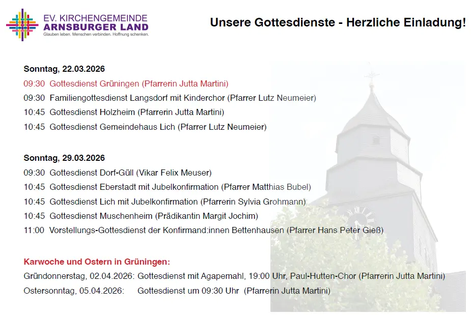 Sie sehen hier auf unserer Noch-Bezirkswebseite unter dem Menü „Gottesdienste“ wie gewohnt die Grüninger Gottesdienste, aber auch einen Gottesdienstplan für die Kirchengemeinde Arnsburger Land als Einladung, uns gegenseitig bei Gottesdiensten zu besuchen.