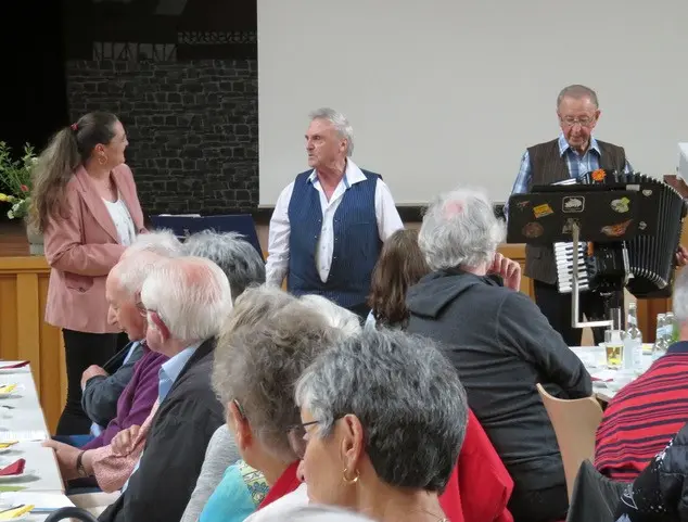 Gerhard Fay sang zur Begleitung von Horst Schepp (Akkordeon) viele schöne, leichte Lieder und animierte die Seniorinnen und Senioren auch zum Mitsingen einiger Stücke. Bei den „Tulpen aus Amsterdam“ wurden rote und gelbe Servietten geschwenkt, je nach Farbe der besungenen Blumen. Es gab außerdem ein Duett mit Enkelin Natascha Steinberg. Dankeschön!!
