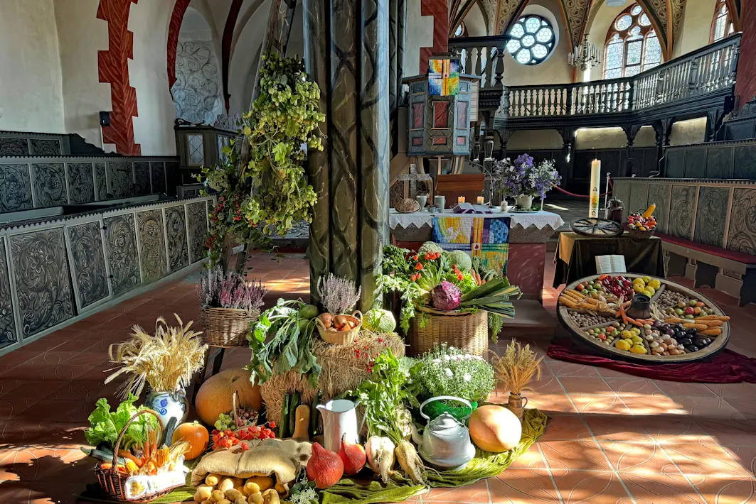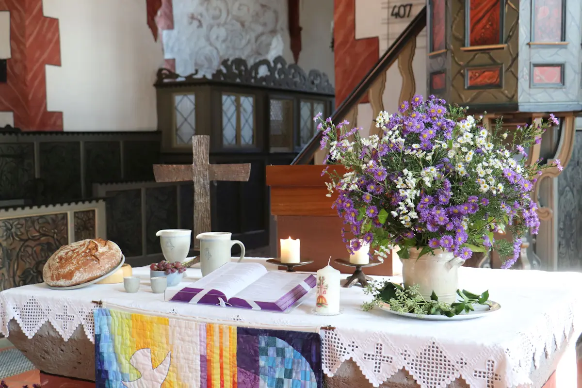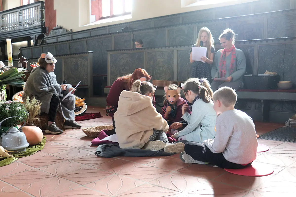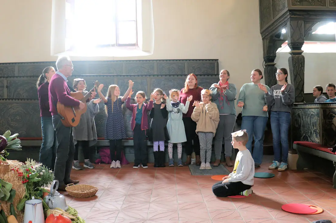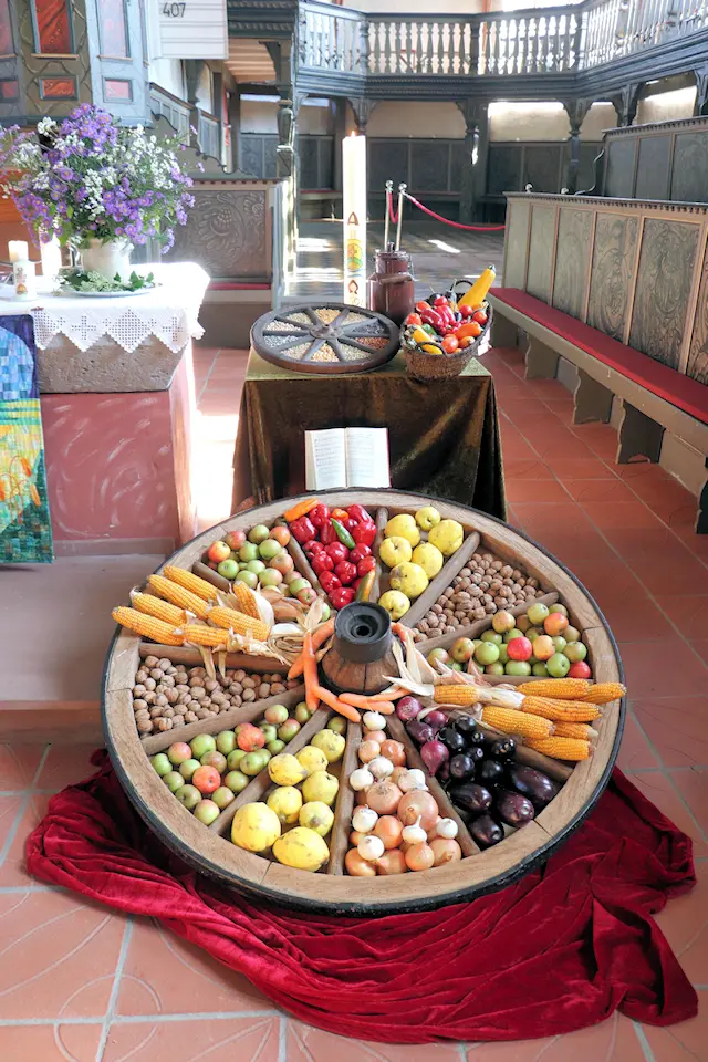 Unterstützt wurde diese Botschaft von der prächtig geschmückten Kirche. Heidrun Korte (Küsterin) sowie Gerdi Leidich und Christel Marsteller aus dem Kirchenvorstand hatten bereits am Vortag mit großer Kreativität und viele Liebe die Kirche gemeinsam mit der Pfarrerin festlich dekoriert. Eine Vielfalt von Früchten, Gemüse und Getreide erzählte von der Fülle des geschenkten Lebens. Michaela Ottinger und Natascha Steinberg (Kirchenvorsteherinnen) beteiligten sich an der Liturgie. Zusammen mit Nadine Pfeffer, Merle Steinberg, Jonna Hirz und Elisa Abel bilden sie das Kindergottesdienst-Team, das das Frederick-Spiel der Kinder begleitet hat.