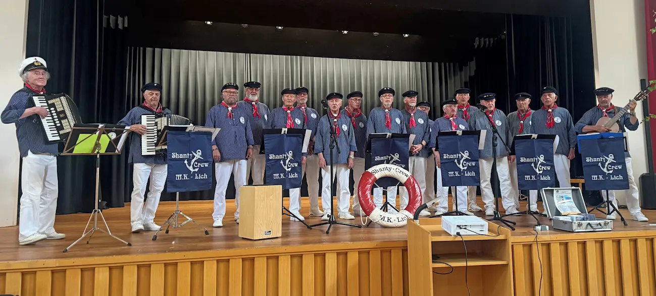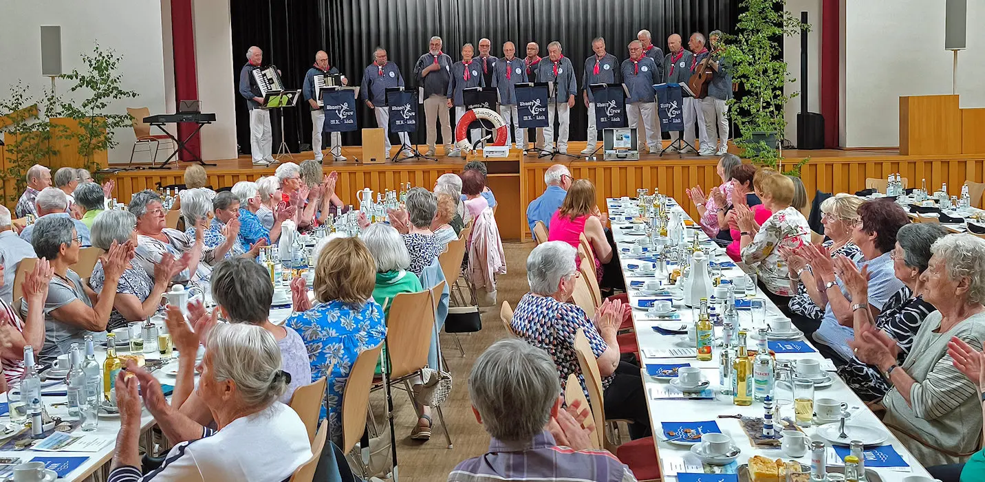 Rolling home… Es fehlte keiner der Klassiker, als die „Shanty-Crew der Marinegemeinschaft Lich und Umgebung 1982 e.V.“ in der Grüninger Limeshalle auf der Bühne stand. Mit seemänischer Kluft - und für alle Fälle einem Rettungsring - begeisterte der Männer-Chor mit Mitgliedern aus der gesamten Region die zahlreichen Gäste. Gleich zwei Schifferklaviere und die Mundharmonika sowie ein Rhythmus-Instrument waren im Einsatz. Mit viel Humor und augenzwinkernd führten uns die Männer durch ihr Programm, und die Seniorinnen und Senioren sangen und schunkelten kräftig mit. Pfarrerin Jutta Martini hatte den Nachmittag wie immer mit einer kleinen Andacht begonnen, diesmal zu Psalm 23 in einer Fassung aus dem Norden (Der Herr ist mein Kompass). Nach dem ersten Teil des Programms gab es Kaffee und Kuchen und Zeit für einen Austausch an den Tischen. Zudem liefen auf der Leinwand Fotos aus dem Norden, die einige Sehnsucht nach der Nordsee weckten.