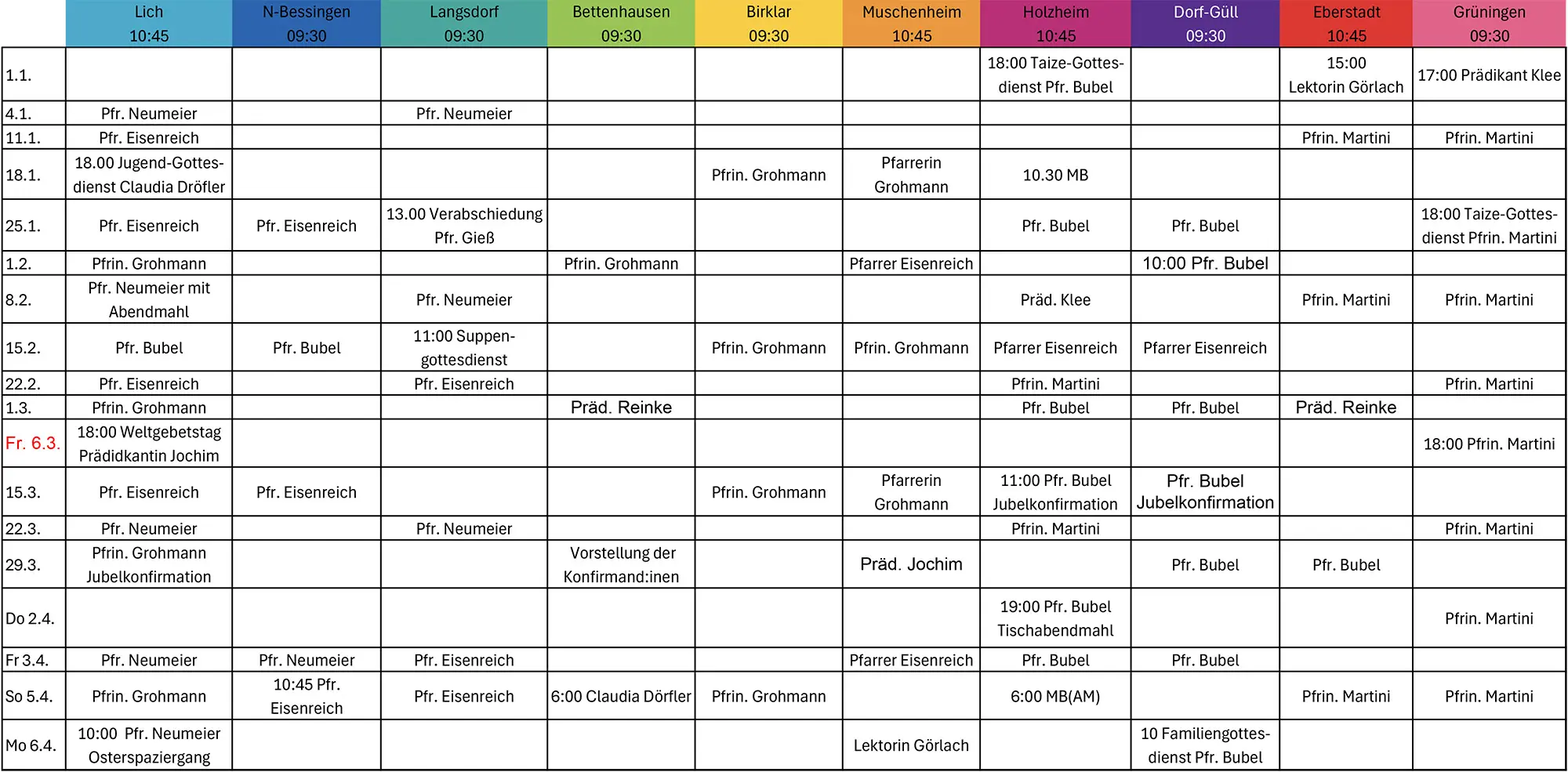 Die Gottesdienste an allen Orten der Kirchengemeinde Arnsburger Land finden Sie entweder auf der neuen Webseite www.arnsburgerland.de oder in der untenstehenden Tabelle. Diese können Sie mit einem Klick vergrößern und hier herunterladen.