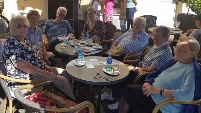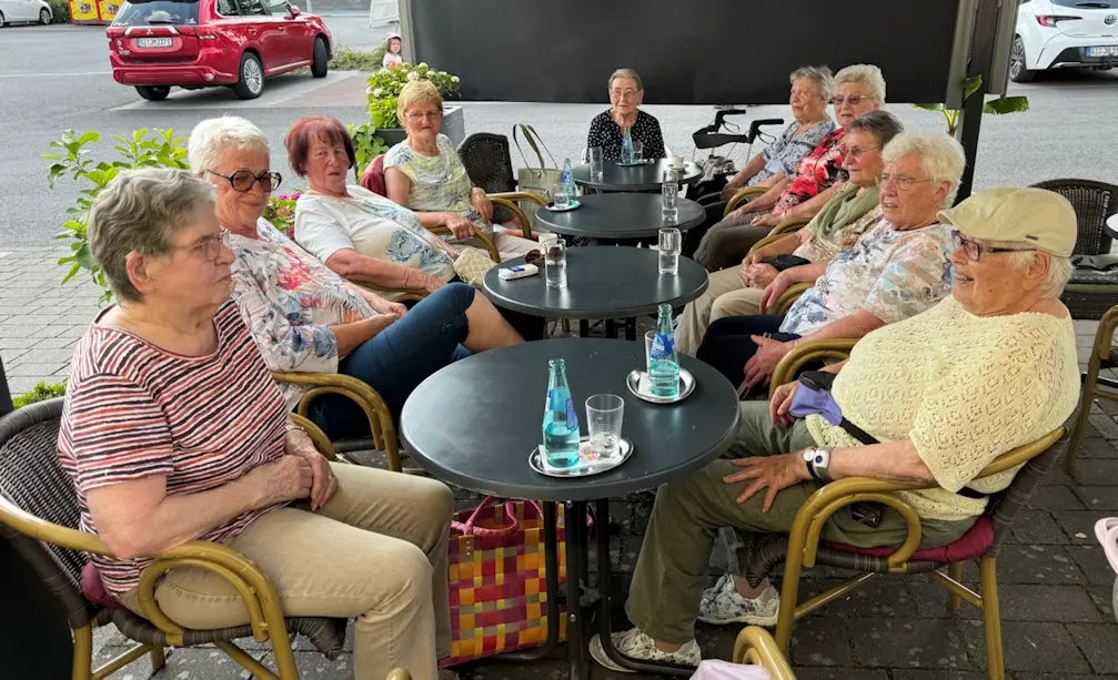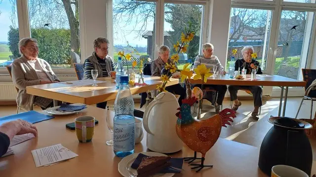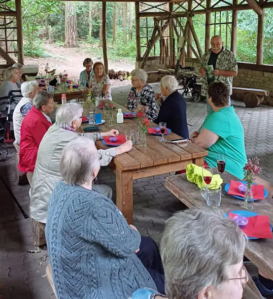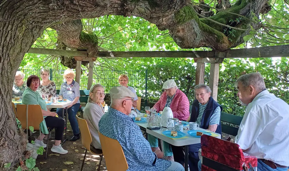 Dort waren die Tische bereits für die Kaffeetafel gedeckt. Überraschend kam die Tochter von Mechthild dazu, denn die hatte an diesem Tage Geburtstag. Darauf haben alle gerne angestoßen!