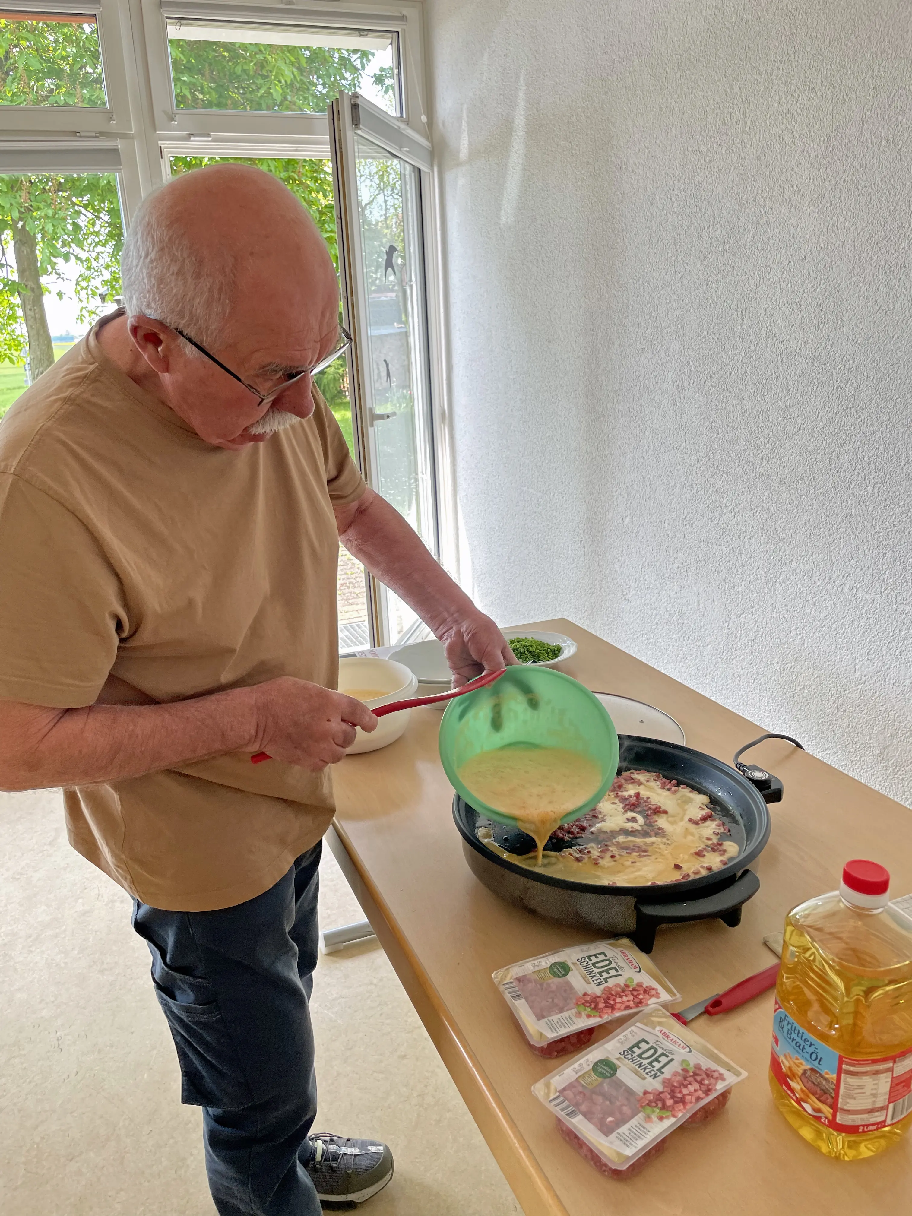 Bitten musste unser Frauenkreis aber nicht: Erika Bender brachte köstliches Brot, Butter, Speck und sehr, sehr viele aufgeschlagene Eier mit - und ihren Mann Werner, der dafür sorgte, dass daraus Rührei wird.
