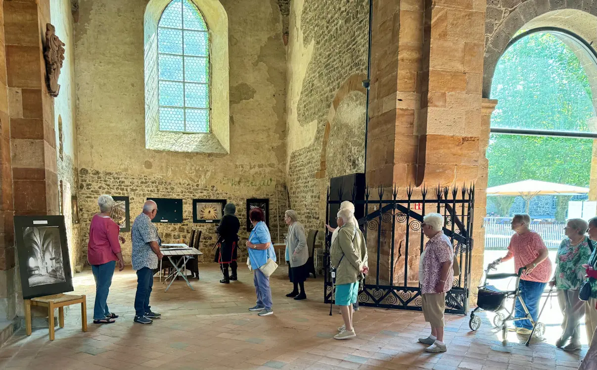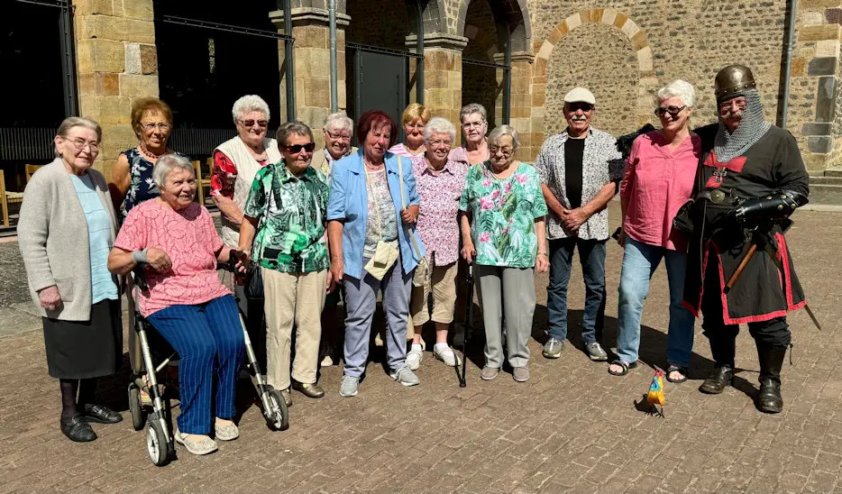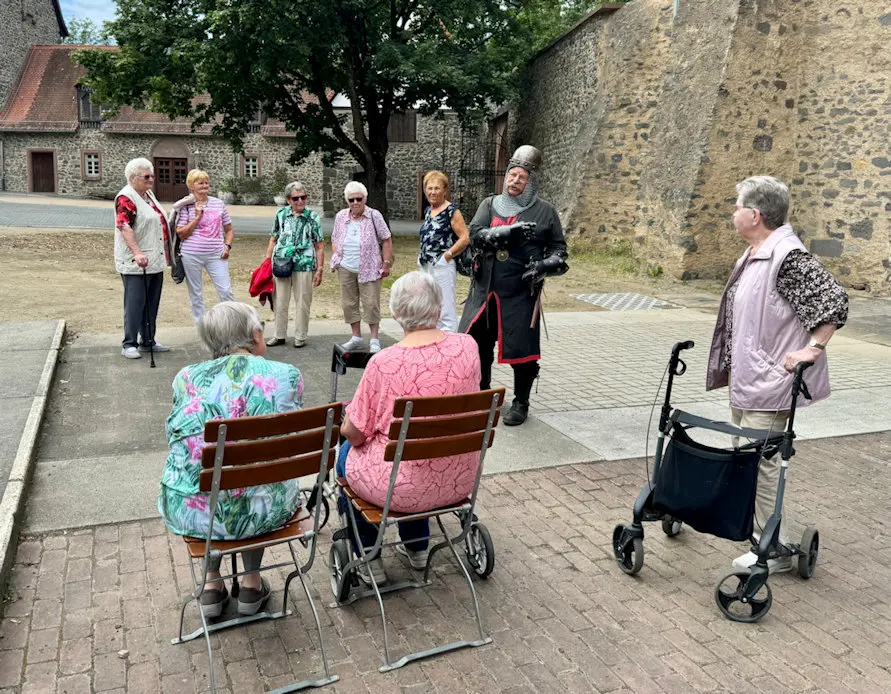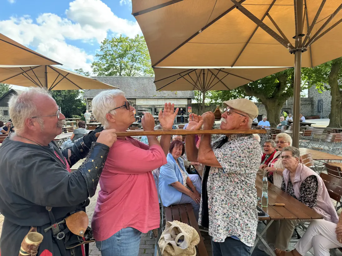 Der Höhepunkt des Sommers war unser Ausflug auf den Schiffenberg am 08. August. Wir hatten dort eine kleine Führung mit Peter Meilinger im Deutschherren-Putz als „Kloster-Geist“, den wir durch das Entschlüsseln einiger Rätsel erlösen mussten. Das haben wir natürlich geschafft. Unter anderem hat Werner Bender die Übung „Ringe über ein Schwert werfen“ gemeistert. Wir erfuhren viel über die lange und wechselhafte Geschichte des weithin sichtbaren Klosters, z.B. dass sich im Chor mit der älteste Dachstuhl Hessens befindet, man bei Ausgrabungen gut erhaltene Skelette fand und wie die Statue der Maria mit Kind wieder zu ihrem Kopf kam, den spielende Kinder in den 60ern im Wald fanden.