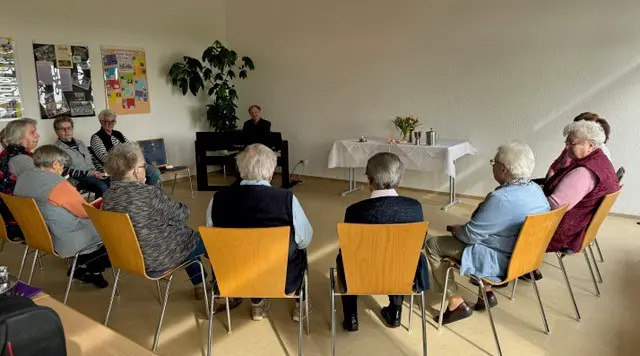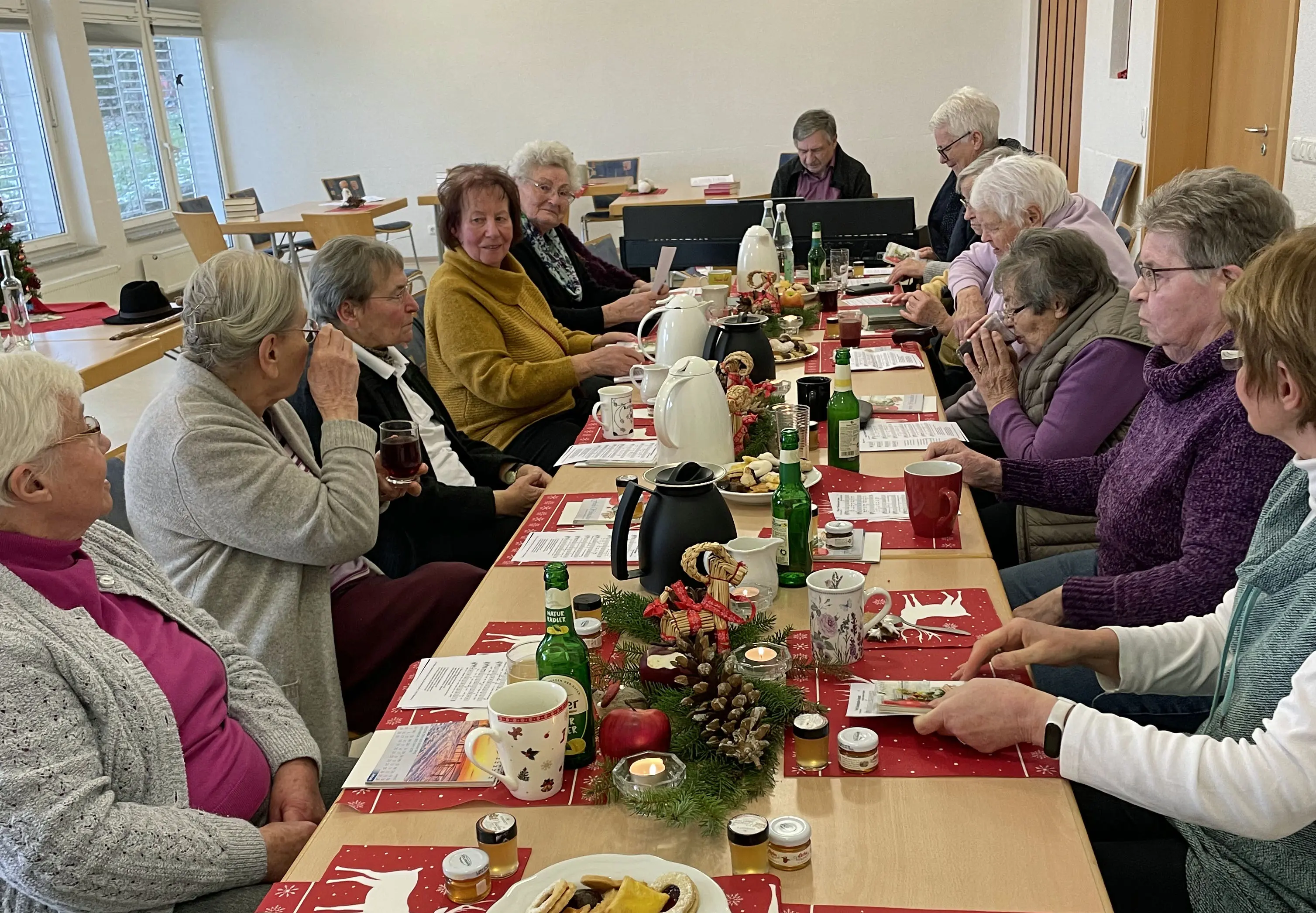 Am 14. Dezember fand unsere Weihnachtsfeier statt. Dazu gehört immer eine feierliche Abendmahls-Andacht mit Frau Martini. Außerdem kam Herr Mosebach dazu und hat uns am E-Piano beim Singen der Weihnachtslieder unterstützt. Frau Martini las heitere und nachdenkliche Geschichten und Gedichte zum Weihnachtsfest vor. Leider war Erika krank und konnte nicht dabei sein.