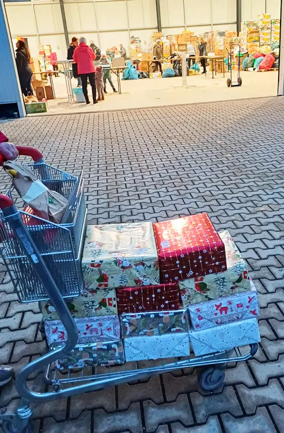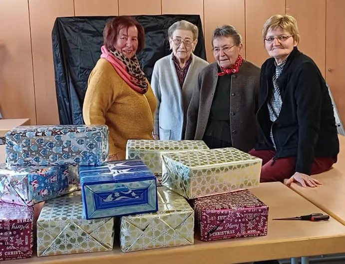 Im Jahr 2022 hatten die Frauen Päckchen für Obdachlose gepackt und nun, in 2023, für die Ukraine-Hilfe Langgöns. Die Schuhkartons dafür bringt Frau Ehrlich aus dem Schuhgeschäft mit. Es wurde im Frauenkreis gesammelt, und Erika Bender hat eingekauft. In den Päckchen befand sich u.a. ein Kuscheltier, Süßigkeiten, Kuschelsocken und etwas für die Kinder: ein Memory-Spiel, Malbuch mit Stiften oder Knete. Die Packaktion hat den Frauen viel Freude gemacht. Insgesamt hat es für 11 Päckchen gereicht. Benders haben die Päckchen dann nach Langgöns gefahren, wo sie in einer großen Halle der Firma Eimer zum Weitertransport gesammelt werden.