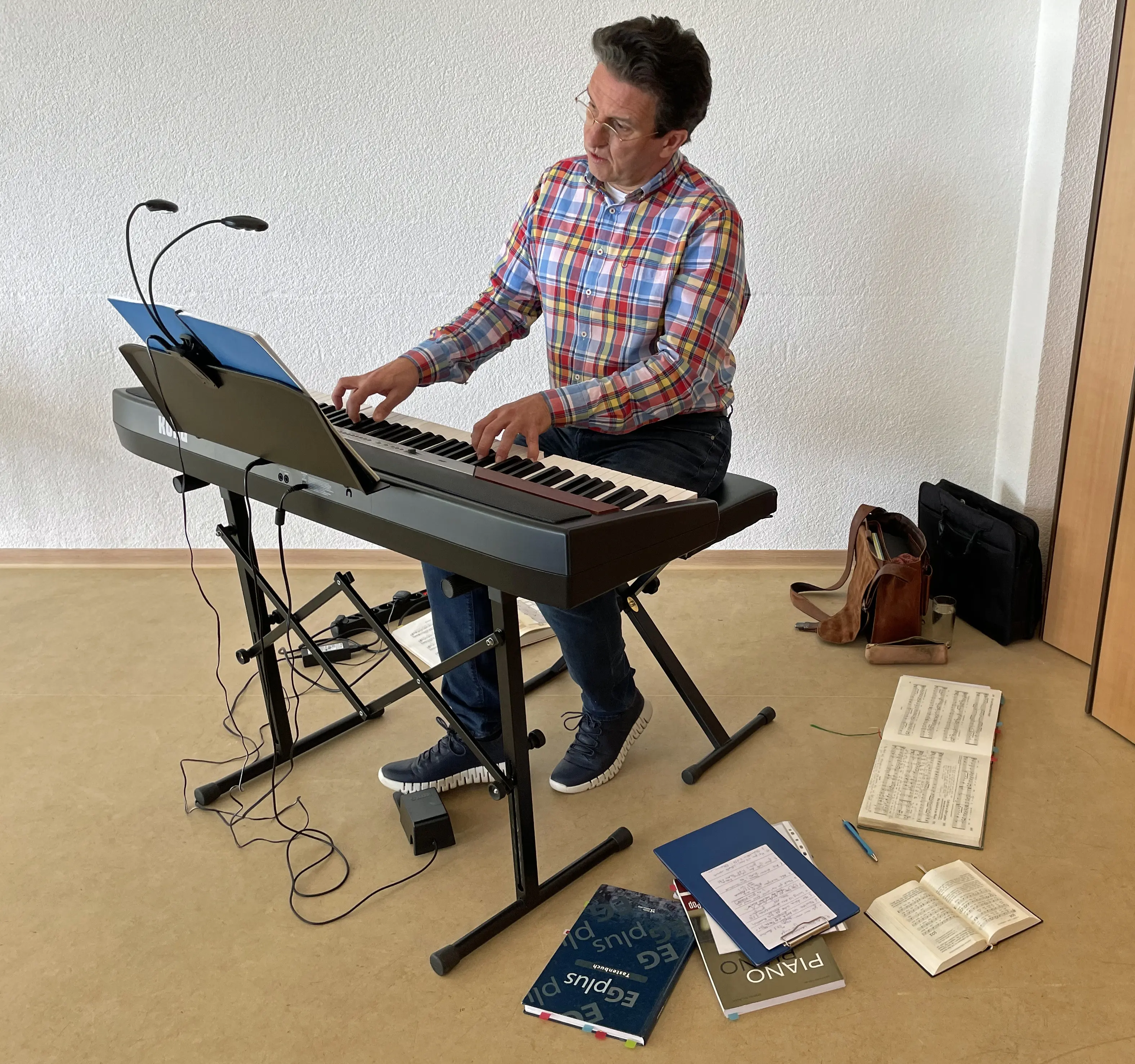 Im frühlingshaft geschmückten Gemeindesaal erklangen dann viele alte jahreszeitliche Lieder. Denn der Frauenkreis hatte eine Wunschliste erstellt, und Christoph Kälberer begleitete die Frauen gerne und sehr entspannt dabei an unserem Keyboard.