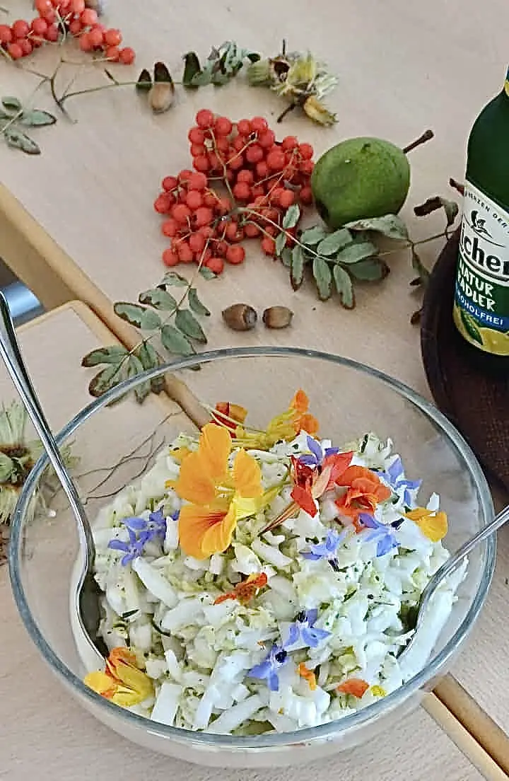 Werner erklärte das Konzept des Forstgartens. Dazu hatten alle Frauen ein Döschen vor sich mit Früchten, Blättern, Moos und vielem anderen, das im Wald zu finden ist. Was ist was, wo wächst es?